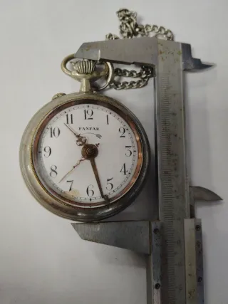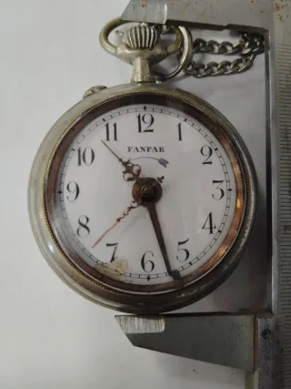 Espectacular reloj de bolsillo antiguo de la marca Fanfar. Con más de 9 centímetros hace poco la última v z que lo mire funcionaba no se que le a podido ocurrir lo vendo para repasar un reloj de bolsillo antiguo difícil de ver de colección .... - Diseño de bolsillo. - Cadena metálica.