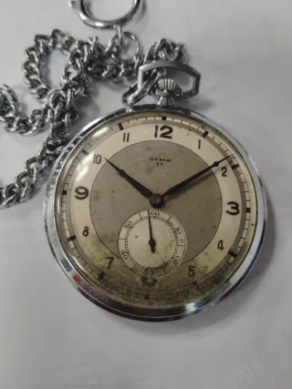 Elegante reloj de bolsillo de caballero de la marca CYMA. - Modelo CYMA 14. - Diseño clásico con cadena. - Esfera con números arábigos y segundero.