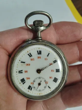 Elegante reloj de bolsillo antiguo de la marca MARNIA. 15 Rubí . Funcionando - Esfera blanca con números arábigos. - Subesfera para los segundos. - Caja de metal plateado.