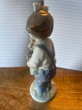Figura de porcelana de la marca NAO, perteneciente al grupo Lladró. Representa a una niña con un lazo en el pelo y un pequeño animal en brazos. - Diseño detallado y delicado. - Acabado brillante característico de la porcelana. - Base de porcelana con acabado verde.