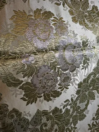 Preciosa tela brocada con diseño floral y detalles en hilo dorado. Ideal para proyectos de costura y decoración. - Medidas: 50x70cm. - Diseño floral con bordado dorado. - Textura lujosa y brillante.