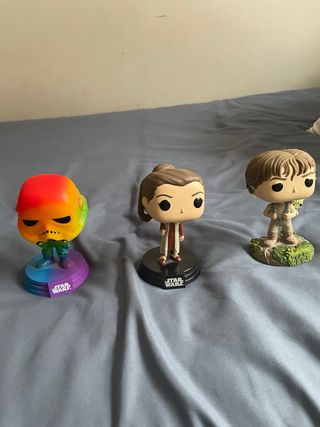 Lote de tres figuras Funko Pop de Star Wars. - Figura de Stormtrooper con diseño arcoíris. - Figura de Rey. - Figura de Luke Skywalker.