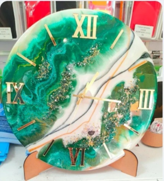 Elegante reloj de pared fabricado en resina con un diseño moderno y llamativo. Sus tonos verdes y dorados le dan un toque único.(SE HACEN ENCARGOS A GUSTO DEL CLIENTE) - Diseño artesanal en resina. - Detalles en pan de oro y piedras decorativas. - Números romanos dorados. - Mecanismo de reloj incluido. Se les puede añadir luces led. IDEAL PARA SU HOGAR, REGALOS ORIGINALES.