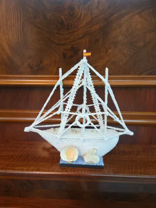 Bonita maqueta de barco decorativa, elaborada con sal y conchas. - Base decorada con conchas marinas. - Mástiles y velas detallados. - Bandera española en la punta del mástil.
