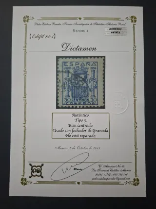 1936. Escudo de España Usado con fechador de Granada Bien centrado No está reparado OJO muchas falsificaciones, de hay la importancia de estar certificado o tener dictamen de su autenticidad