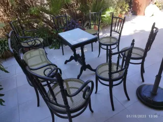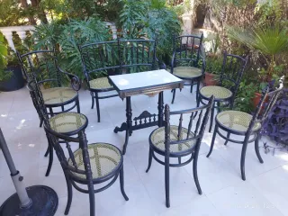 Conjunto de mesa y sillas con más de 100 años de antigüedad. - Diseño clásico y elegante. - Ideal para coleccionistas o amantes de lo vintage. Compuesto por sofá, 2 sillones, 5 sillas y mesa de centro.