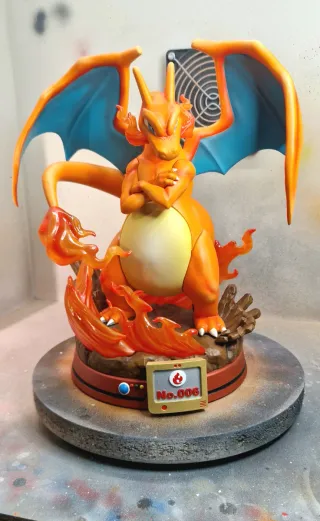 Figura coleccionable de Charizard hecha de resina. - Escala 1/6. - Mide aproximadamente 30 cm de altura. - Base temática con efectos de fuego.