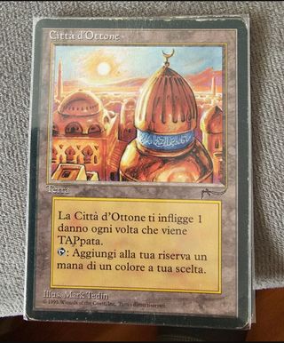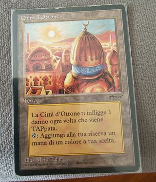 Vendo dos copias de la carta "Ciudad de Bronce" de Magic: The Gathering de la expansión "Rinascimento", las dos en el estado que se ve en la foto (algunas marcas de desgaste en bordes). Envío o venta en mano