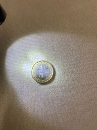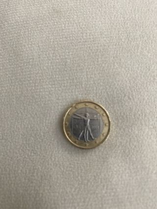 Moneda de 1 euro conmemorativa de Italia del año 2002. - Diseño de la Cara Nacional: El Hombre de Vitruvio de Leonardo da Vinci. - Borde exterior con las doce estrellas de la Unión Europea.
