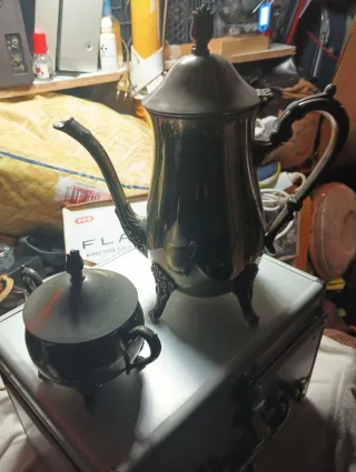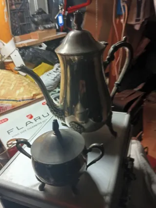 Conjunto de jarra y azucarero de alpaca con un diseño antiguo. - Jarra con asa y pico curvo. - Azucarero con tapa y dos asas. - Piezas con detalles ornamentales.