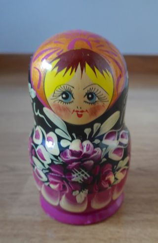 Muñeca rusa de madera en tonos morados, todas las muñecas están en buen estado, menos la última que tiene más signos de desgaste. Mide 14 cms de alto