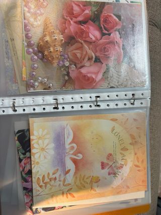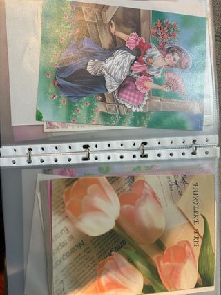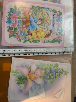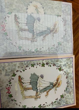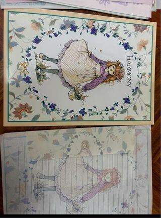 Conjunto de papelería con diseños vintage, ideal para coleccionistas o para enviar cartas. - Incluye sobres y hojas. - Ilustraciones de estilo romántico y floral. - Diseños con figuras de niñas y escenas campestres.
