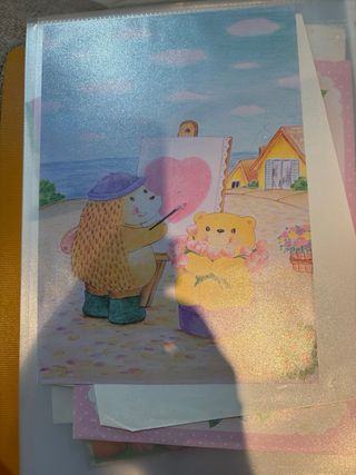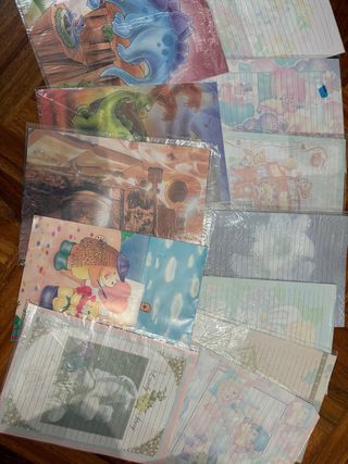 Conjunto de papelería con diseños infantiles y tiernos. - Incluye hojas para escribir y sobres. - Motivos de ositos y personajes. - Ideal para cartas o notas.