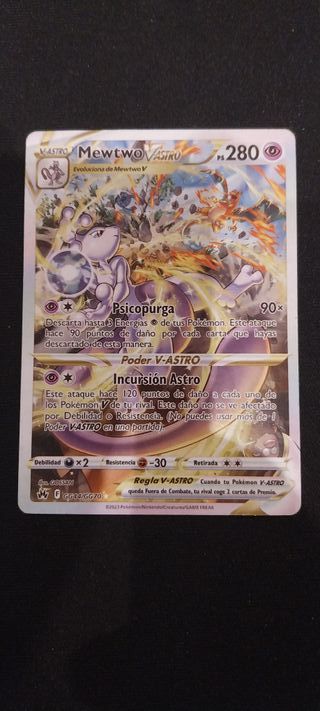 Carta Pokémon de Mewtwo Vastro con 280 puntos de salud. - Ataque: Psicopurga - Poder V-ASTRO: Incursión Astro - Regla V-ASTRO: Cuando tu Pokémon V-ASTRO queda Fuera de Combate, tu rival coge 2 cartas de Premio. - Año de publicación: 2023