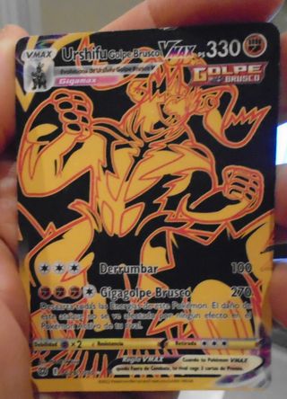 Carta Pokémon Urshifu Golpe Brusco VMAX con 330 PS. - Tipo: VMAX - Ataque principal: Gigagolpe Brusco - Habilidad: Derrumbar - Debilidad: x2 - Retirada: 3 energías