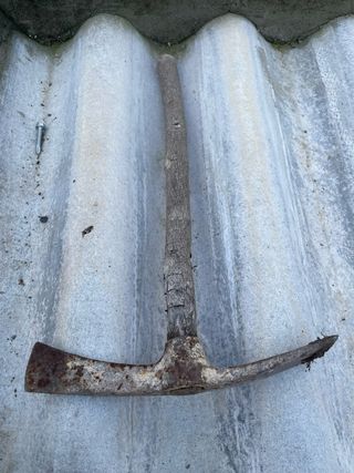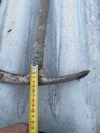 Herramienta antigua tipo picola, con mango de madera y cabeza de metal oxidado. - Mango de madera. - Cabeza de metal con dos puntas.