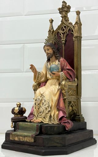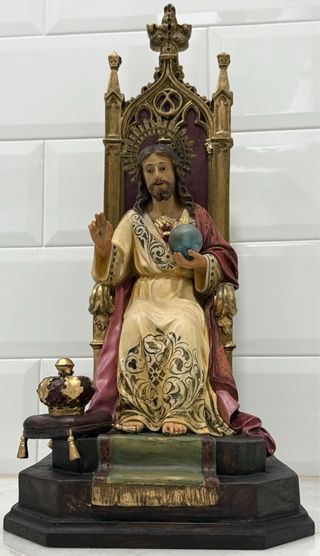 Antiguo y espectacular Sagrado Corazón de Jesús entronado de principio de 1900 de primera calidad estofado a la fina hoja de oro realizado en pasta de madera policromado a mano con aureola en latón dorado labrado, sobre base de madera y ojos en pasta vítrea de la prestigiosa casa Olot. Una verdadera pieza de colección con una calidad de detalles y materiales excepcionales. Pequeña limpieza para que brille en todo su esplendor.Véanse las fotografías para hacerse una mejor idea de los detalles que forman parte de la descripción.Medidas: 59 cms de alto, 26 cms de ancho y 26 cms de fondo. ENVIAMOS CON TRANSPORTE Y EMBALAJE PROFESIONAL.