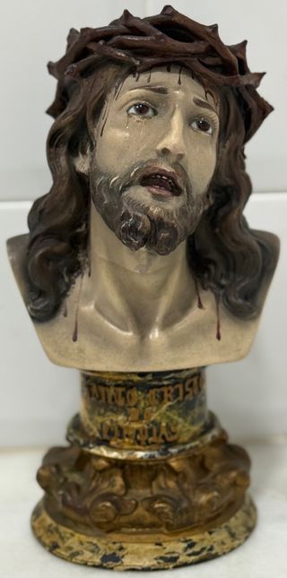 Antigua y espectacular figura religiosa representando al SANTO CRISTO DE LIMPIAS de la primera mitad del siglo XX realizada en pasta de madera con ojos en pasta vítrea sobre base de madera sellada por la famosa casa de Olot “Arte Olotense Olot”. En excelentes condiciones de conservación para su antigüedad y uso. Una verdadera joya realizada y policromada artesanalmente. Véanse las fotografías para hacerse una mejor idea de los detalles que forman parte de la descripción. Medidas: 27 cms de alto, 14 cms de ancho y 11,5 cms de fondo. ENVIAMOS CON TRANSPORTE Y EMBALAJE PROFESIONAL.