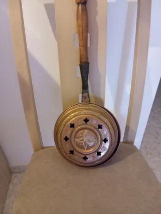 Pieza antigua de cobre, utilizada para calentar camas. - Material: Cobre. - Mango de madera. Alguna señal de uso sin importancia, mide 21 cm de diámetro y 77 de largo aprox.