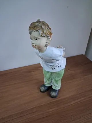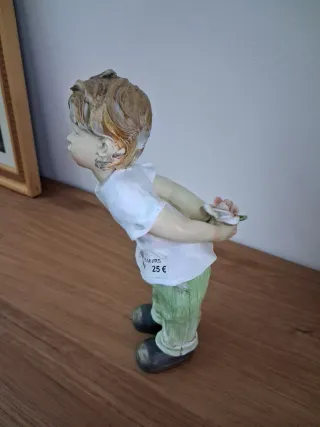 Figura decorativa de un niño con una flor. - Detalle de flor en las manos. - Pantalones verdes y camiseta blanca. Medidas: 26x10x12.