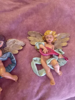 Preciosa pareja de angelitos decorativos, pintados a mano. - Diseño con alas y cintas. - Uno toca la lira y el otro un laúd. Preparados para colgar en la pared
