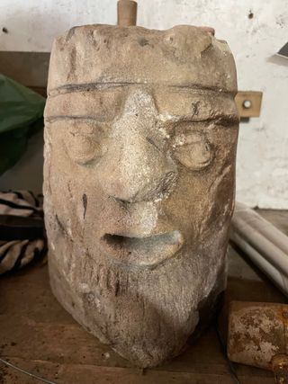 Estatua antigua con un diseño único, elaborada a mano. - Material de piedra. - Rostro con rasgos marcados. - Base sólida.
