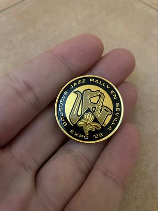 Pin conmemorativo del Expo '92 en Sevilla, con diseño del Brussels Jazz Rally. - Diseño circular con borde negro y dorado. - Ilustración central de un saxofón y un lirio. - Inscripción BRUSSELS JAZZ RALLY EN SEVILLA EXPO '92.