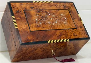 Espectacular y elegante caja/joyero del siglo XX de estilo Napoleón III realizada en madera de raíz de tuya y palo santo maciza con marquetería de maderas nobles y de incrustaciones de nácar con una bandeja organizadora con compartimentos extraible y sistema de cierre funcional con llave original. En excelentes condiciones de conservación. Una verdadera pieza de colección. Medidas: 12 cms de alto, 26 cms de ancho y 18 cms de fondo. ENVIAMOS CON TRANSPORTE Y EMBALAJE PROFESIONAL.