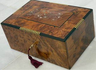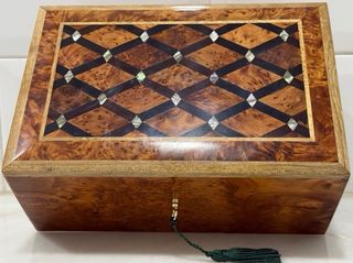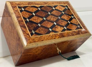ELEGANTE CAJA MADERA RAÍZ DE TUYA Y NÁCAR.
