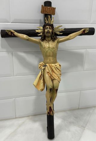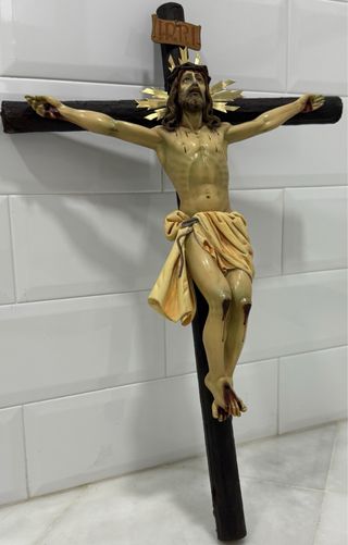 Antiguo y espectacular Cristo crucificado de origen español de los famosos talleres de Olot “EL RENACIMIENTO OLOT” sellado con sello en latón de los primeros años del siglo XX originalmente realizado en pasta de madera policromado artesanalmente con potencia en latón dorado cincelado y con cartel de INRI. Limpieza para que brille con todo su esplendor.Véanse las fotografías para hacerse una mejor idea de los detalles que forman parte de la descripción. Medidas Cruz: 73 cms de alto, 47,5 cms de ancho y 14 cms de fondo. Medidas Cristo: 46 cms de alto y 42 cms de ancho y 11 cms de fondo. ENVIAMOS CON TRANSPORTE Y EMBALAJE PROFESIONAL.