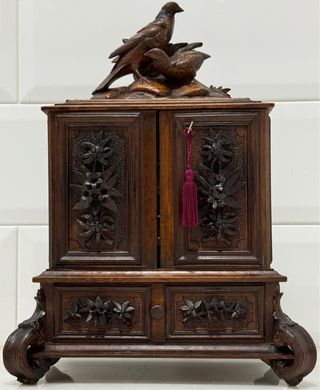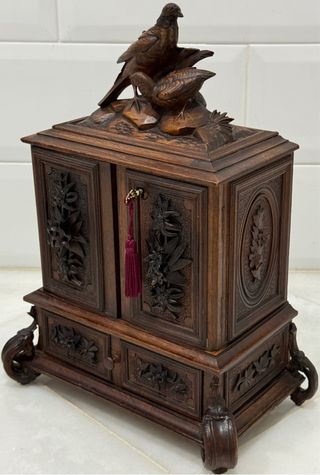 Antigua y espectacular caja joyero de estilo selva negra, original de Alemania de la segunda mitad del siglo XIX realizada en madera de Roble con bellísimos motivos florales y animales de la propia madera tallada finalmente por los artesanos de la época, con precioso interior con 3 cajones y uno exterior forrados en tela adamascada y buen estado de conservación para su antigüedad. Sistema de cierre funcional de época y llave. Una verdadera pieza de colección única y elegante! Pieza restaurada y con alguna falta. Medidas: 40 cms de alto, 29 cms de ancho y 16 cms de fondo. ENVIAMOS CON TRANSPORTE Y EMBALAJE PROFESIONAL.