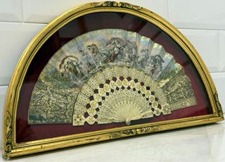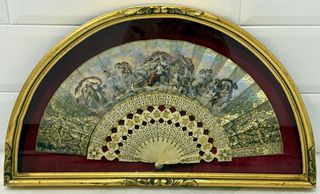 Antiguo y elegante abanico de estilo romántico del siglo XIX de origen español y estilo isabelino con varillaje en hueso artesanalmente tallado con adornos en hoja de oro y paisaje en papel pintado a la acuarela en abaniquera tallada y sobredorada a la hoja de oro fino sobre fondo en tela de terciopelo todo original de época sin restauraciones. Una verdadera joya de colección única y exclusiva. Véanse las fotografías para hacerse una mejor idea de los detalles que forman parte de la descripción.Medidas abaniquera: 63 cms de ancho, 36,5 cms de alto y 5,5 cms de fondo. ENVIAMOS CON TRANSPORTE Y EMBALAJE PROFESIONAL.
