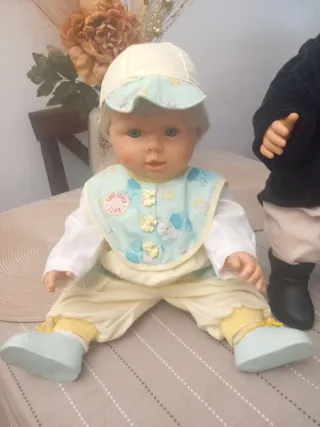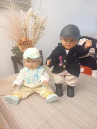 Dos muñecos Feber. - Uno vestido de jinete con casco y botas. - Otro vestido con ropa de bebé, gorro y babero. No es negociable