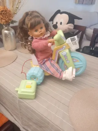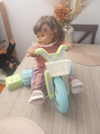 Muñeca antigua con su triciclo y control remoto. - Triciclo de color verde y azul. - Muñeca con vestido rosa y pantalón a rayas. - Incluye control remoto. No funciona, hay que hacerle un apaño en el compartimento de batería.