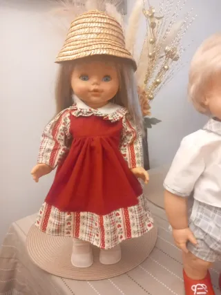 Conjunto de muñecas antiguas con vestidos. - Muñeca con sombrero de paja y vestido rojo. - Otra muñeca con camisa blanca y pantalón a cuadros. No funciona. Precio por unidad