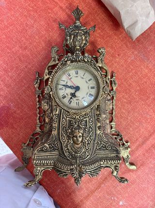 Elegante reloj de sobremesa con un diseño vintage y acabado dorado. - Detalle de leones y rostro en la estructura. - Esfera con números romanos. - Base ornamentada con figuras.