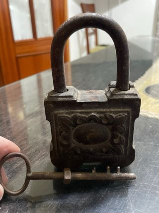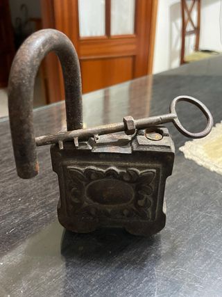 Candado de estilo antiguo con su llave original. Presenta un diseño decorativo en su cuerpo. - Material: Metal oxidado. - Incluye llave. - Mecanismo de apertura visible.