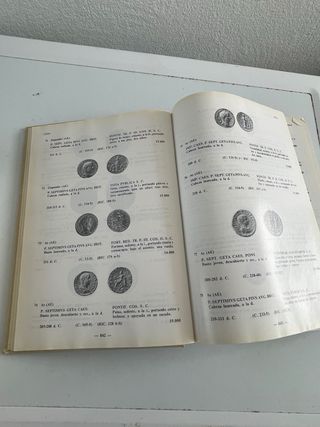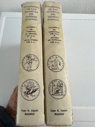 Conjunto de dos volúmenes del Compendio de las Monedas del Imperio Romano. - Volumen I: De Pompeyo el Grande (81 a. C.) a Julia Domna (198 d. C.). - Volumen II: De Caracalla (198 d. C.) a Juliano de Pannonia (285 d. C.). - Publicado por Juan R. Cayón, Madrid.