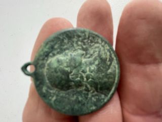 Medallón antiguo con un bonito acabado de pátina verde. - Diseño circular. - Presenta un colgante para poder ser llevado. - Pieza con historia y carácter.