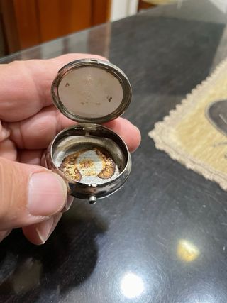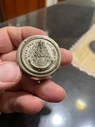 Pastillero con la imagen de la Virgen del Rocío. - Diseño circular. - Grabado detallado de la Virgen.