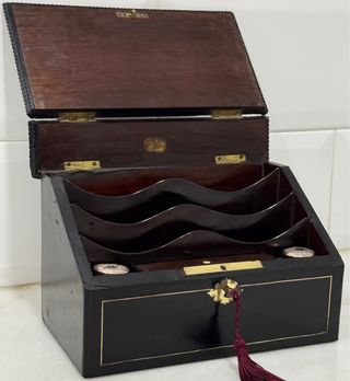 Espectacular y elegante caja de escritura de origen francés de mediados del siglo XIX y estilo Napoleón III realizada en madera noble ebonizada con un exquisito trabajo de marquetería con incrustaciones de latón dorado. Su interior contiene diferentes compartimentos, uno con tapa y dos tarros con tapa labrada para tinta. Una joya única en buen estado de conservación para su antigüedad y uso. Una pieza única de colección!Véanse las fotografías para hacerse una mejor idea de los detalles que forman parte de la descripción.Medidas: 15,5 cms de alto, 24 cms de ancho y 16 cms de fondo. ENVIAMOS CON TRANSPORTE Y EMBALAJE PROFESIONAL.