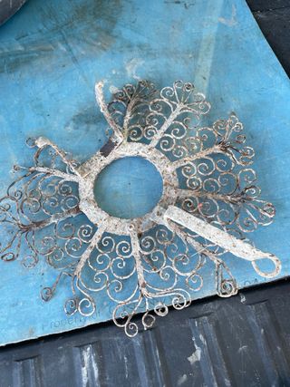 Este aplique de forja es una pieza decorativa con un diseño intrincado y un acabado envejecido. - Elaborado en metal con detalles de volutas. - Estilo rústico y ornamental. - Apto para interiores o exteriores cubiertos.
