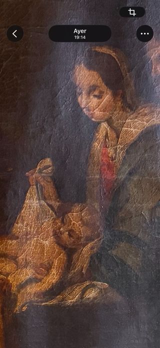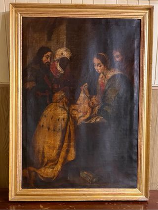 Escucho ofertas,”La adoracion de los reyes” Pintura al óleo de temática religiosa, datada en el siglo XIX. La obra representa una escena de la Natividad con la Virgen María, San José y los Reyes Magos. - Marco dorado incluido. - Lienzo de gran formato. - 90x60