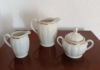 Conjunto de porcelana vintage de Santa Clara, ideal para añadir un toque clásico a tu mesa. - Diseño elegante con detalles dorados. - Incluye jarra, azucarero y lechera. Año 1.940
