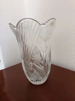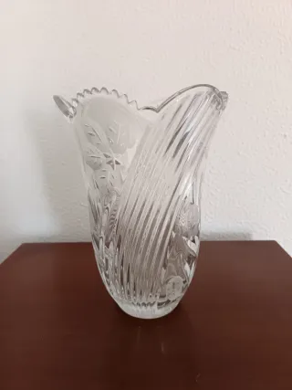 Elegante jarrón de cristal de Bohemia con un diseño vintage. - Material: Cristal. - Acabado: Transparente con detalles tallados y esmerilados. - Diseño: Forma curva con estrías y motivos florales. - Borde decorativo festoneado. Muy pesado