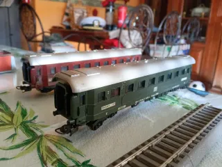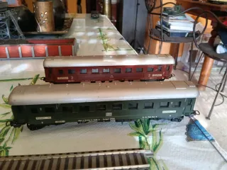 Dos vagones de tren en escala HO, uno de color verde y otro de color burdeos. - Vagón verde con detalles en plata. - Vagón burdeos con techo plateado. Ruedas de ambos vagones metálicas para un buen contacto.se envía sin problema ninguno.