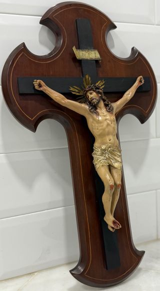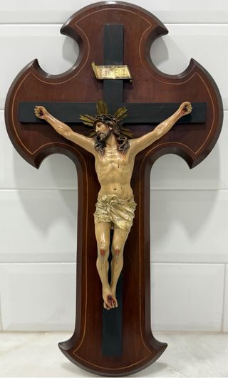 Antiguo y espectacular Cristo crucificado de origen español de los famosos talleres de OLOT” realizado en pasta de madera policromado y estofado a la hoja de oro artesanalmente con potencia en latón dorado cincelado y cruz con cartel también de latón de INRI. Cruz exclusiva en madera maciza y ojos en pasta vítrea. Una verdadera pieza de colección. Véanse las fotografías para hacerse una mejor idea de los detalles que forman parte de la descripción. Medidas Cruz: 65 cms de alto, 38 cms de ancho y 11,5 cms fondo. Medidas Cristo: 33 cms alto y 26 cms ancho. ENVIAMOS CON TRANSPORTE Y EMBALAJE PROFESIONAL.