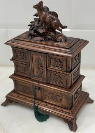 Antigua y espectacular caja joyero de estilo selva negra, original de Alemania de la segunda mitad del siglo XIX realizada en madera de Roble con motivos florales y animales de la propia madera tallada finamente, con precioso interior con cajones y uno inferior forrados en terciopelo verde y buen estado de conservación para su antigüedad. Sistema de cierre funcional de época y llave.Pieza con preciosa pátina del tiempo.Véanse las fotografías para hacerse una mejor idea de los detalles que forman parte de la descripción.Medidas: 30,5 cms alto, 23,5 cms ancho y 15 cms fondo. ENVIAMOS CON TRANSPORTE Y EMBALAJE PROFESIONAL.