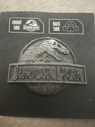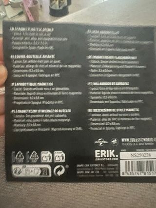 Abridor de cerveza con diseño de Jurassic Park. Cuenta con un imán para colocarlo en superficies metálicas. - Diseño del logo de Jurassic Park. - Parte trasera con imán.