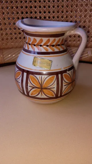 Jarra de porcelana artesanal con diseño tradicional de Talavera. Presenta un acabado esmaltado y detalles pintados a mano. - Motivos florales y geométricos. - Etiqueta dorada con inscripción. - Asa curva y pico vertedor.